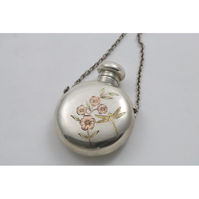 with suspensory chain and screw cover, decorated on one side with an engraved flower and a dragonfly, and on the other with a finch & flower, each heightened by 3-colour gilding, unmarked, c.1880; 2" (5 cms) diameter; 1.5 oz
