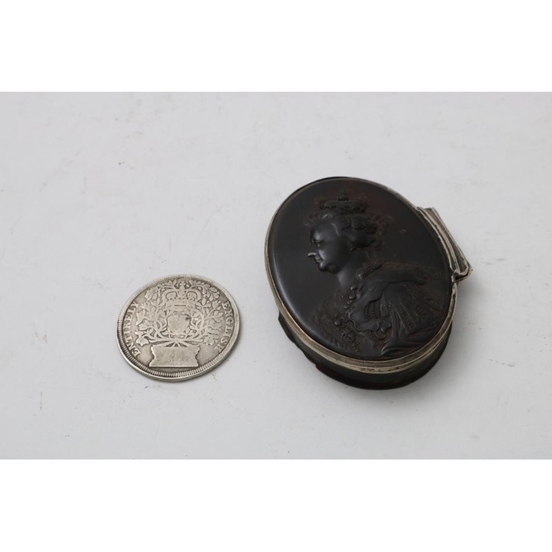 A tortoiseshell snuff box, the cover with embossed portrait of the Queen, interior signed by John O'Brisset (initials OB) silver mounts; 6.5 x 5.5 cms and a silver medallion of her reign inscribed "Entirely English"; 3.5 cms (2)