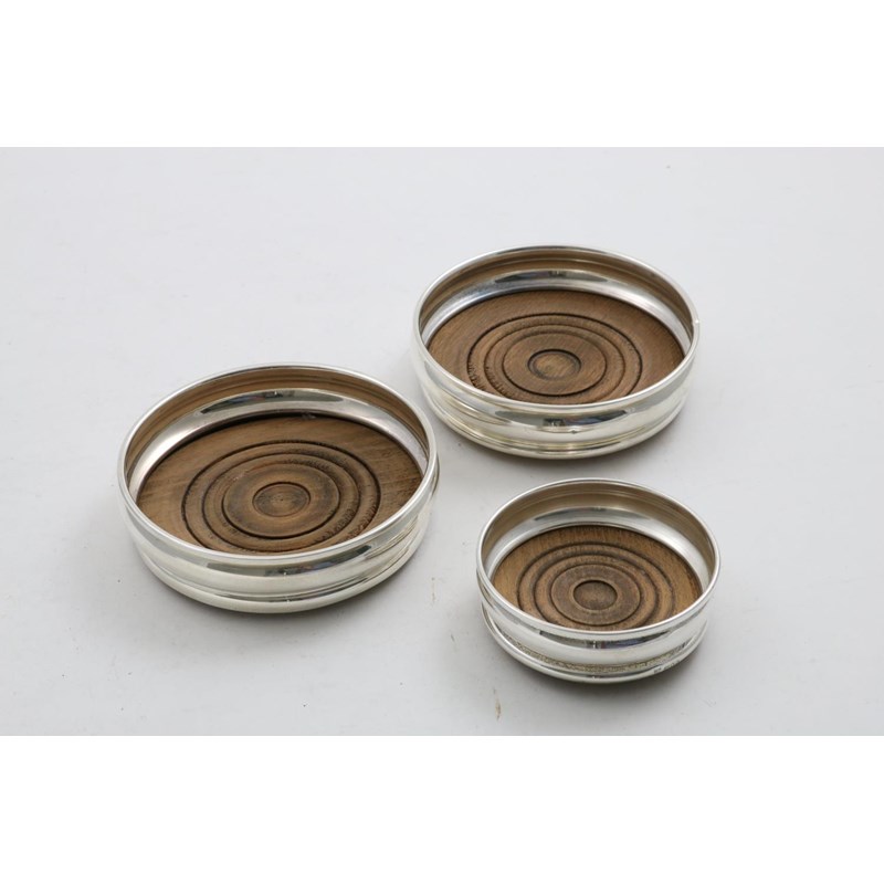 with convex sides and inset, turned wooden bases, maker's mark "CSR LTD", London 1973 and a smaller single example by J.B. Chatterley and Sons Ltd., London 1972; the latter 3.1" (8 cms) diameter (3)