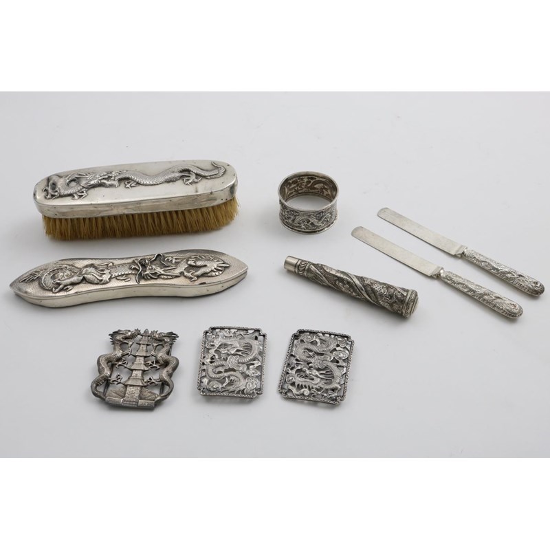 with a pagoda and two dragons, maker's mark "WF" and character mark, c.1900, another Chinese two-piece buckle, two small Chinese knives, a napkin ring, a hair brush, a hairbrush mount (both with dragons) and an Indian parasol handle; the latter 4"  (10 cms) long;  4.4 oz weighable silver  (7)