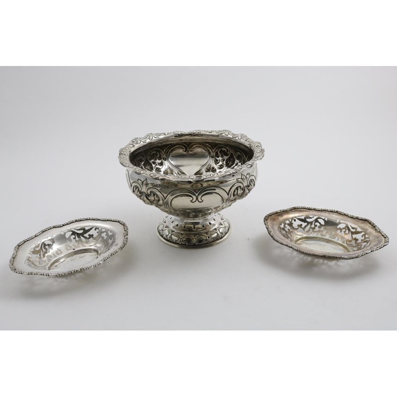 with a shaped rim and four vacant cartouches around the sides, by H. Atkin, Sheffield 1899 and a pair of late Victorian bonbon dishes; the rose bowl 8.25"  (21 cms) diameter;  22.85 oz  (3)