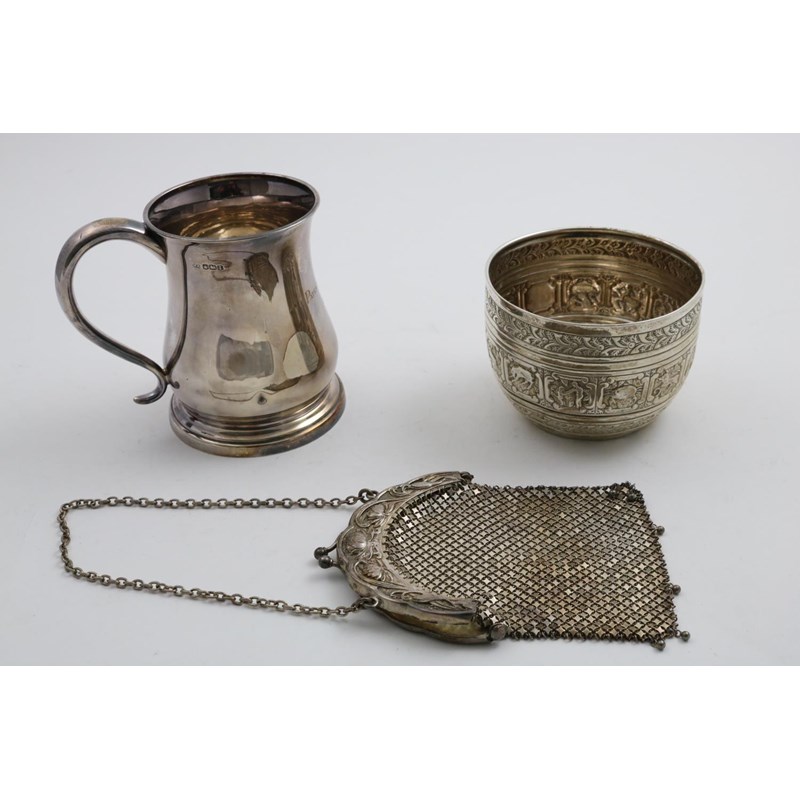 A GEORGE V BALUSTER MUG inscribed, by H. Atkin, Sheffield 1928, a Continental Art Nouveau chain link bag or purse with English import marks for London 1903 and a Victorian embossed sugar bowl with the signs of the zodiac around the sides, initialled, by J.W. Johnson, London 1886; the mug 5.1" (13 cms) high; 21.9 oz (3)