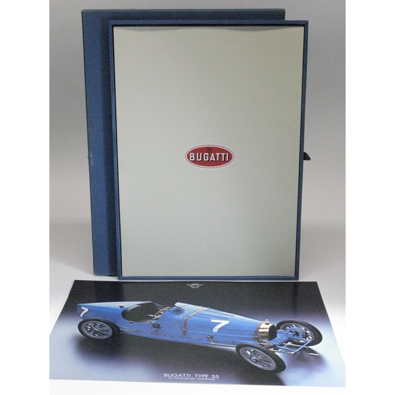 Comprising the documentation which once accompanied a one-eighth scale model Bugatti Type 35. There are ten sheets, each measuring 32 x 45cm, and including several colour photographs of the complete model, a monochrome period photograph, three pages of text with other colour photographic images, a three-colour print of an image of the car by Francis Constanzo, who supervised Art Collection Auto, and a multi-image colour photographic plate illustrating the model's main attendant parts. The sheets are laid in a sturdy tray held in a blue fabric-covered slipcase decorated with the coloured emblem of Art Collection Auto. One of the introductory sheets is signed by H. G. Conway and dated 6 May 1975. Some soiling and rubbing to the slipcase, else in very good condition.