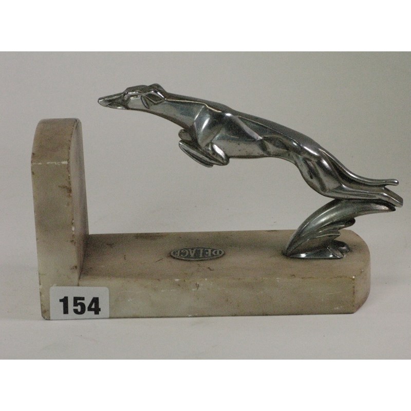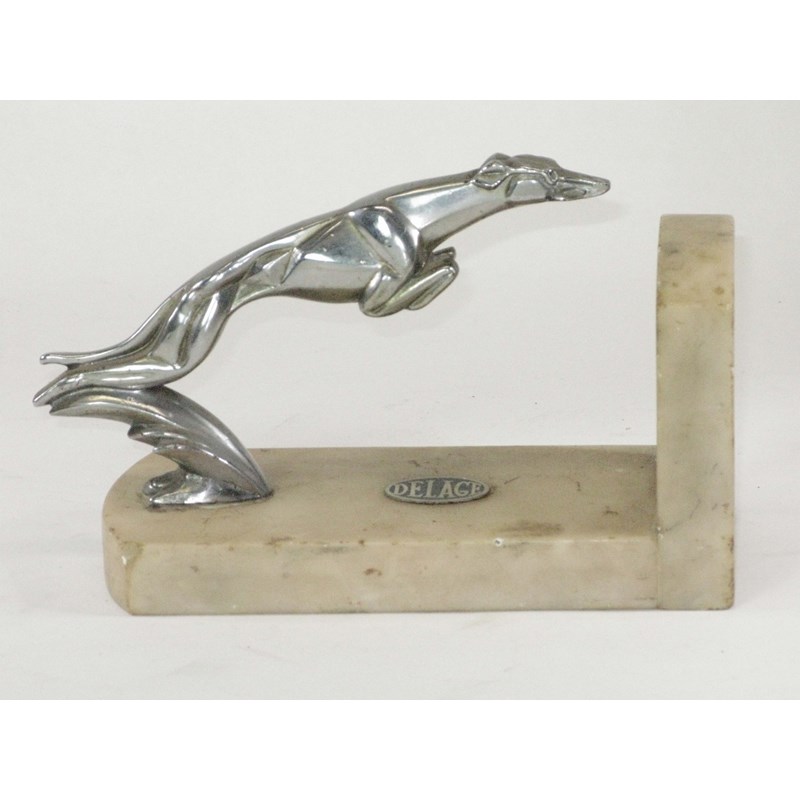 A rare leaping greyhound radiator mascot originally designed by Frenchman Casimir Brau for use on Delage Motorcars from circa 1928. This chromium-plated on brass example will date from the early 1930s. It is, like all of the mascots of this design, unsigned. Mounted on an onyx base, possibly used as a bookend trade gift. The mascot 6½-inches long.