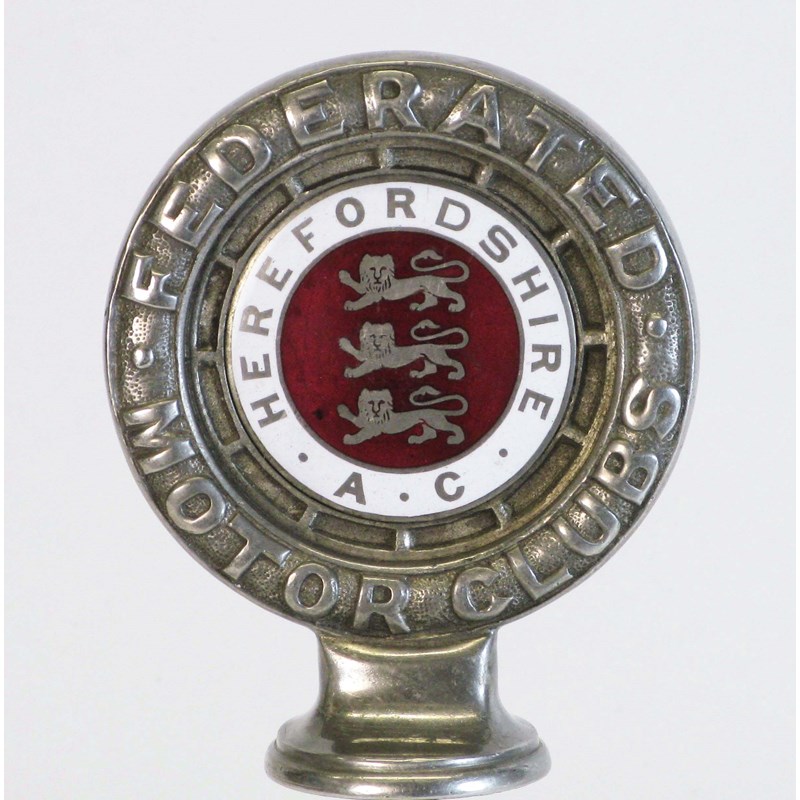 A very rare membership badge with intaglio written 'Federated Motor Clubs' on the outer edge, and a three-colour centre with three lions passant guardant representing the armorial of the county, and the words Herefordshire A.C. around the circumference. The nickel-plated badge numbered 196 recto, and 'Registered Fattiorini Sons Ltd. Bradford' stamped at the base. Original mounting thread and retaining nuts. In excellent condition. The Herefordshire Automobile Club was founded in 1903 and disbanded in December 1931. The club organised local events, to include a 'Small Car Trial' and other rallies. The Hereford Reference library holds the governing paperwork, a club minute book, and other material.