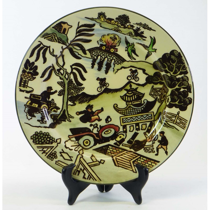 A very rare and possibly unique 'Motoring' plate, being a caricature of the popular blue and white 'Willow Pattern' but in this case with red, yellow and green underglaze tints. The Doulton motif and D3625 (design number?) on the base.