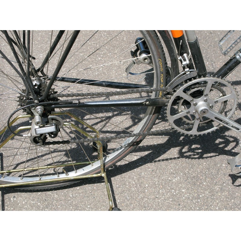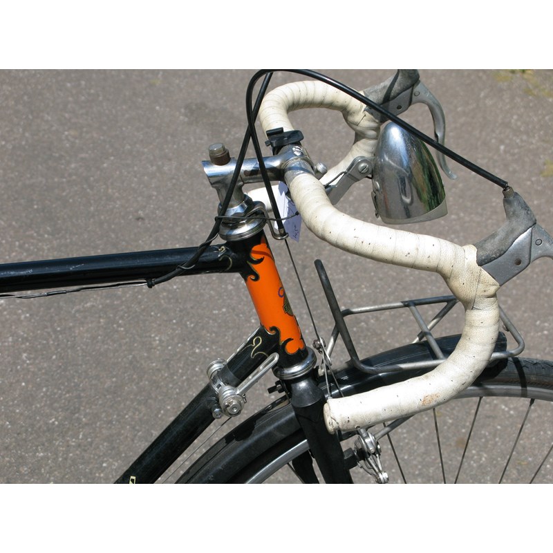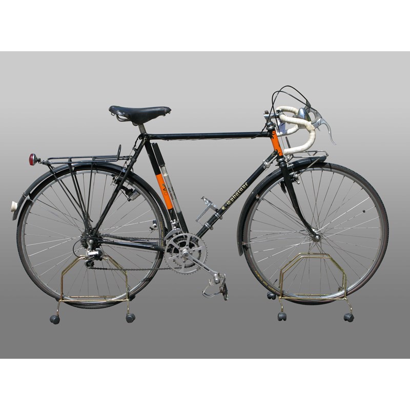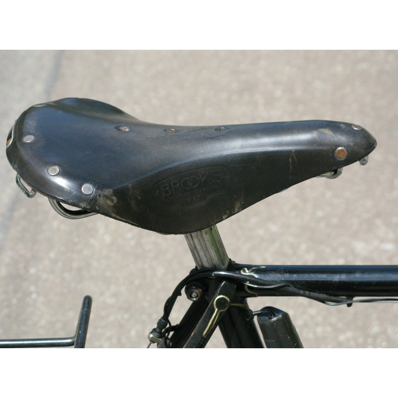 A lightweight bicycle, having a 23-inch black-enamelled frame with lugs lined in gold and spear-point pattern headstock, Brooks B17 saddle, 17-inch 'North Road' drop handlebars fitted to a 2-inch extension, luggage racks fore and aft, Suntour 10-speed gearing with dual-hand control, bottle carrier and dynamo lighting. Frame number indistinct.
