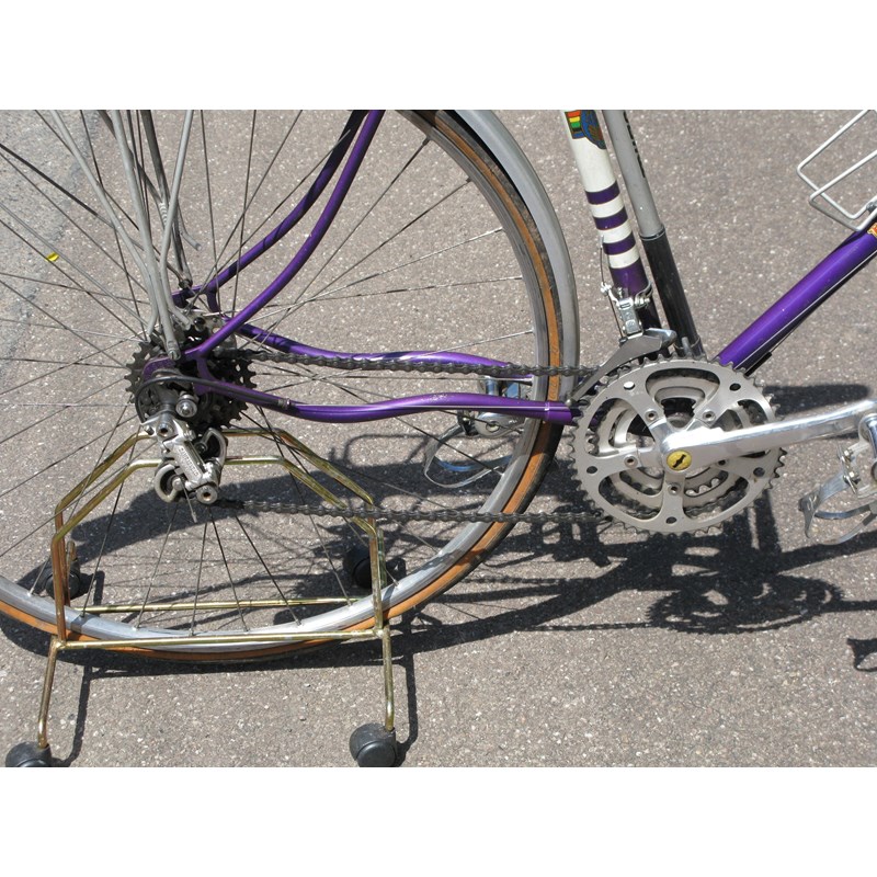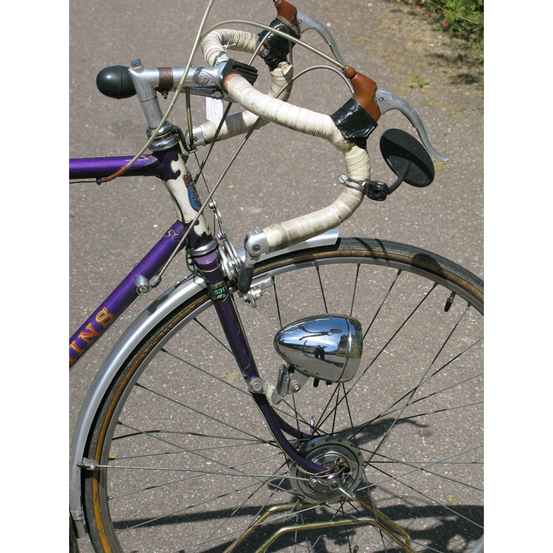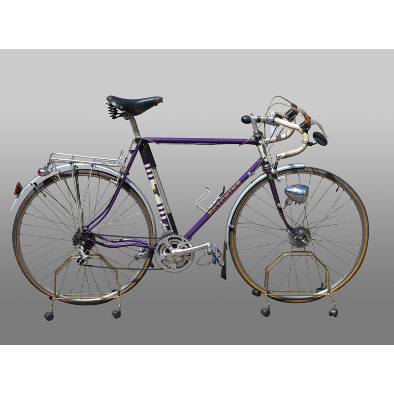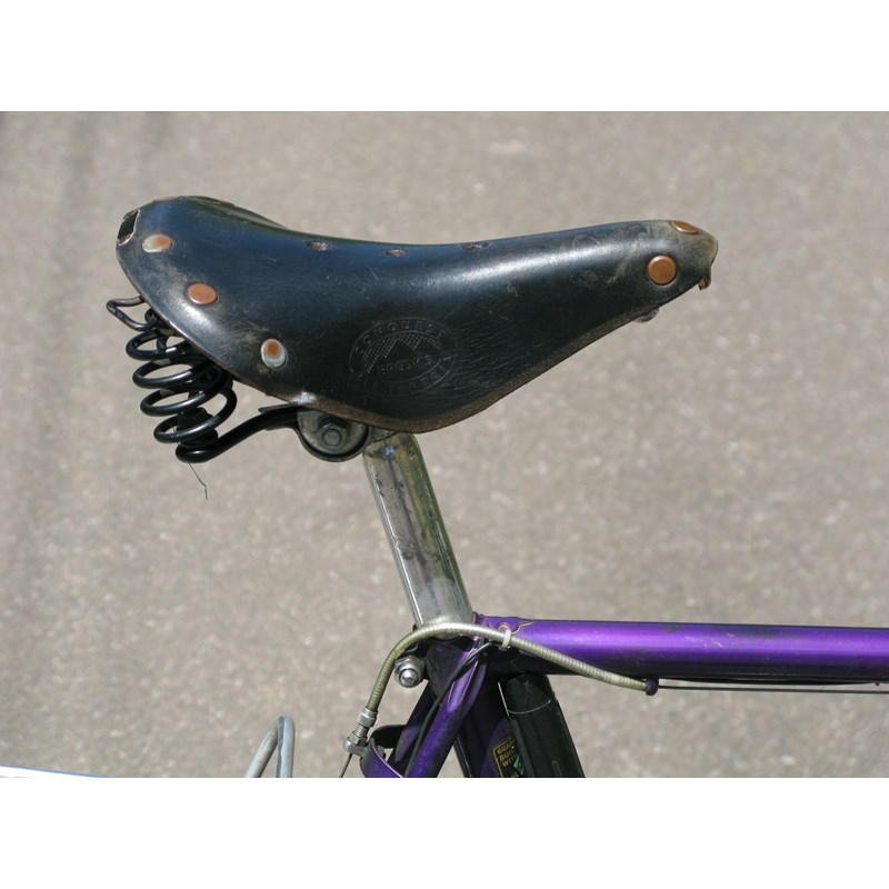 Dating post 1964, with a 23-inch frame numbered H25254 and finished in purple and retaining its original decals. Other features include Campagnolo ten-speed gearing with Suntour handlebar flip controls, clip-on pedals, Brooks 'All Terrain' leather saddle, rear luggage carrier, centre-pull Mafac Racer brakes and 16-inch drop handlebars fitted to a GB extension.