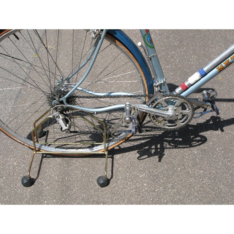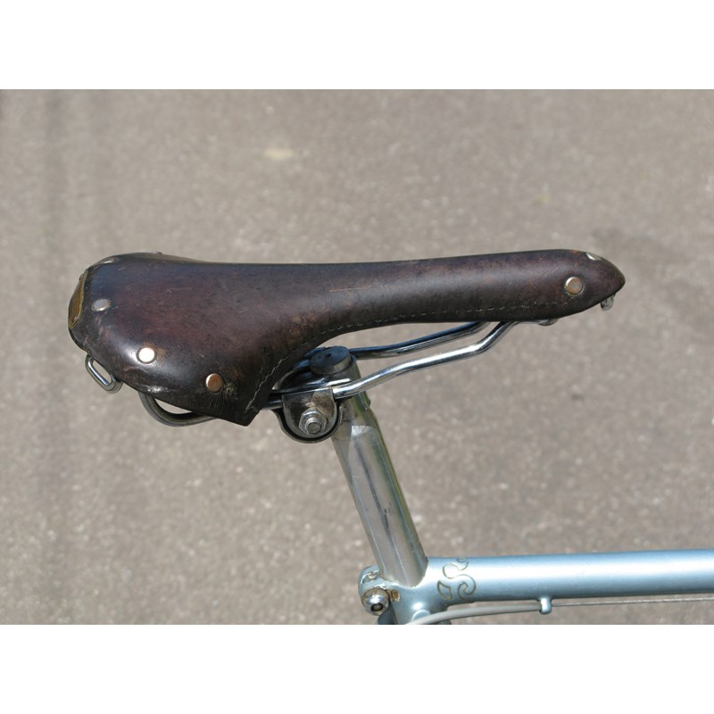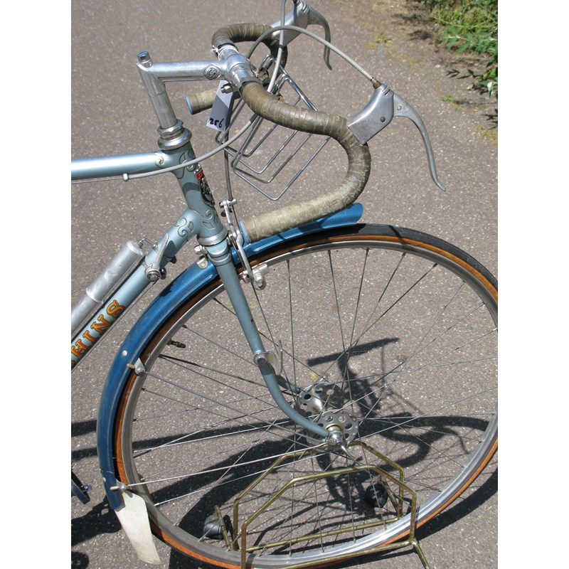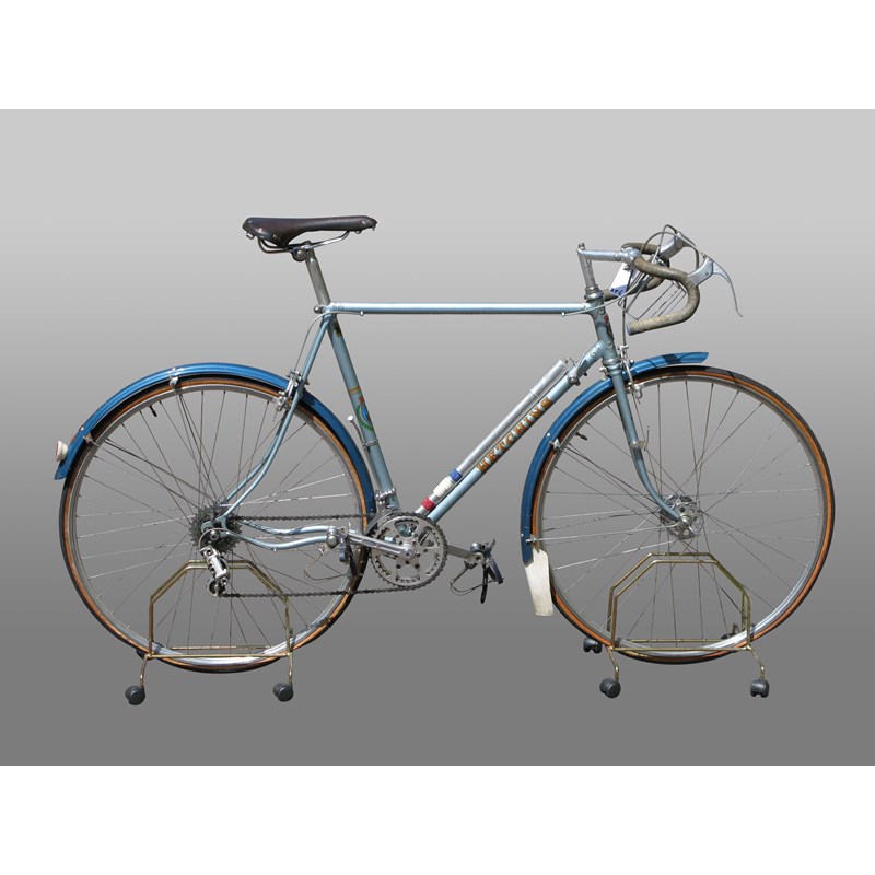 With 22-inch frame numbered H13911, this early bicycle has been finished in light grey and retains Hetchins decals and badging. It comes with a combination Campagnolo five-speed gear with a Benelux chain wheel shifter operated from the seat tube. Also featured are 27-inch Alumlite wheels with large flange hubs, quick release spinners to the front, 18-inch drop handlebars fitted to a GB extension, double bottle holder, leather competition saddle, blue 'All Rounder' Bluemels mudguards, and Berthet Lyotard pedals.