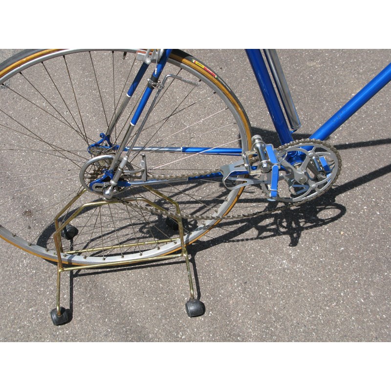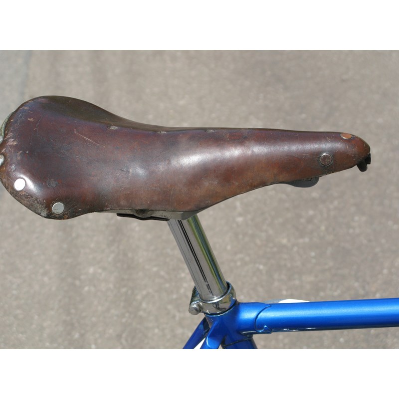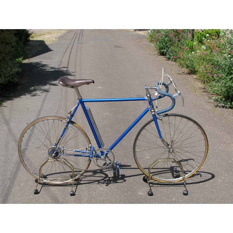 having a 22-inch frame finished in electric blue enamel with polished chromium-plated lugs, side-pull Strata braking, Campagnolo Paris Roubaux four-speed gearing with a rear fork mounted control, pneumatic pump and an 'Ideale' leather saddle, Berthet Lyotard pedals and 'Flamme' 15-inch drop handlebars.