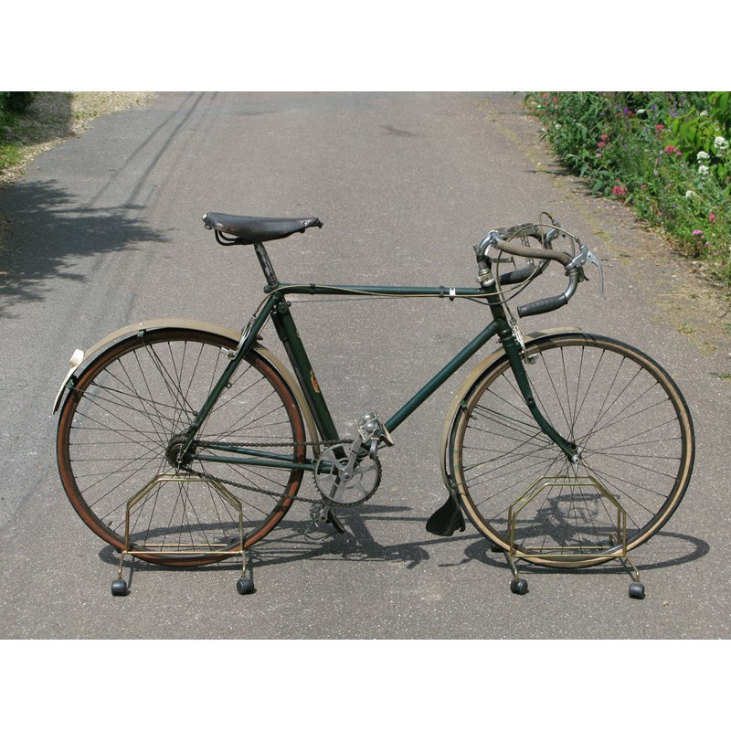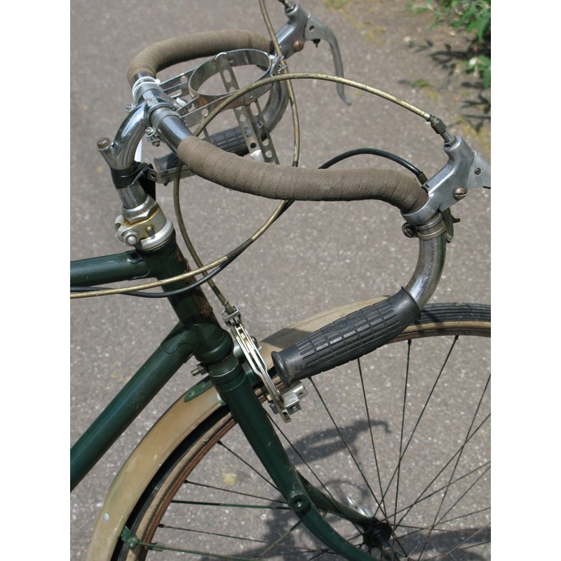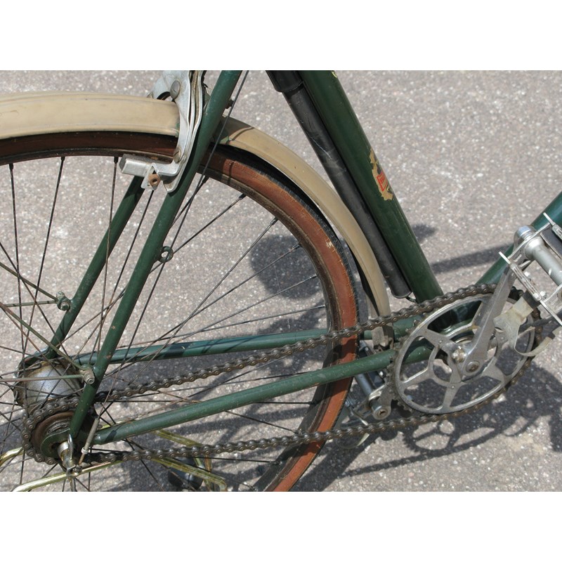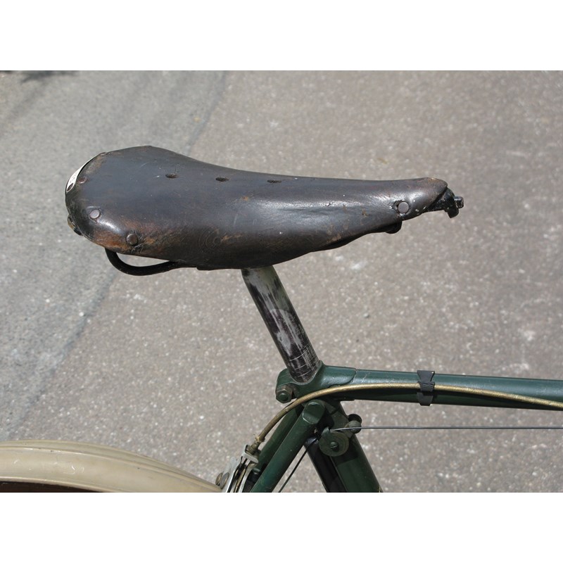 With a 21-inch frame numbered 2107, this is an early 1930s bicycle, delightfully retaining what appears to be its original green enamel finish and the remains of original decals. The drive is via a Sturmey Archer three-speed hub dated 1947 with a lever selector on the 16-inch handlebars, unusual centre-pull TB brakes are fitted, as are rat-trap pedals, Wrights leather saddle, bottle carrier and unusual grey coloured Bluemels mudguards.