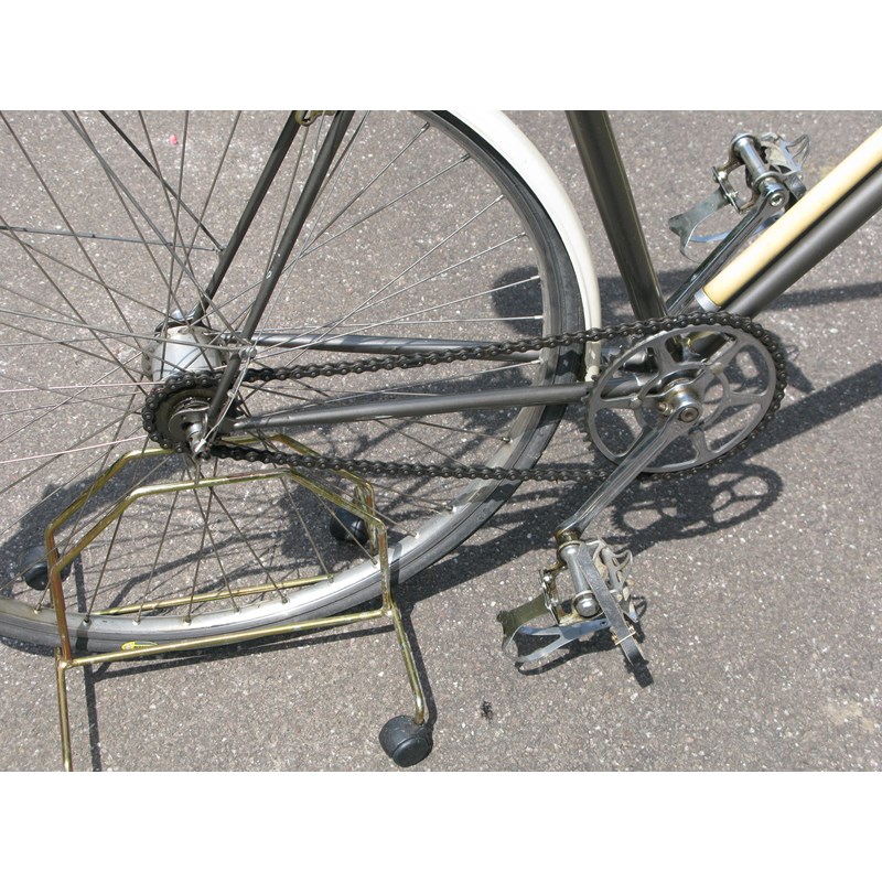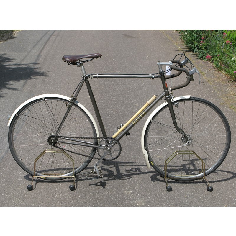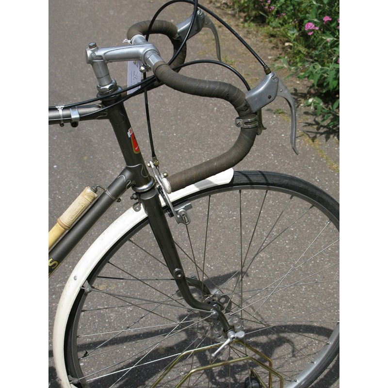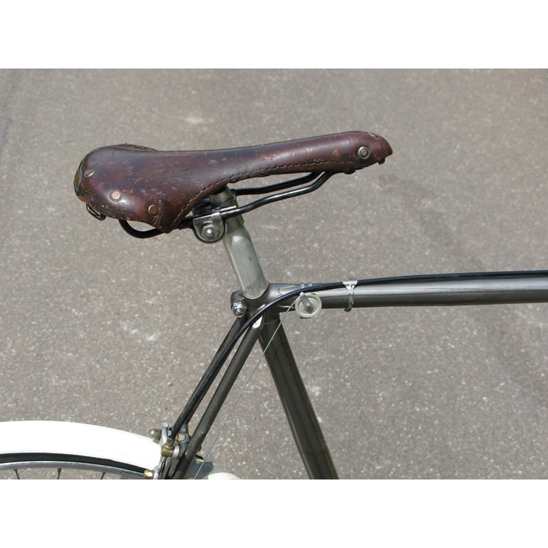 With a 24-inch frame numbered V11830 on the bottom bracket, a sound machine that has been re-enamelled in the past in grey with Bates decals and a Westcliff on Sea insignia on the Ultavert design of headstock. Other standard features include Rigida mudguard stay eyes, Diadrant front forks, 531 tubing (?), a four-speed Sturmey Archer FM medium ratio hub gear dated 1950, Bluemels 'Popular' cream mudguards, and a Brooks competition saddle. There are several small dents on the top tube.