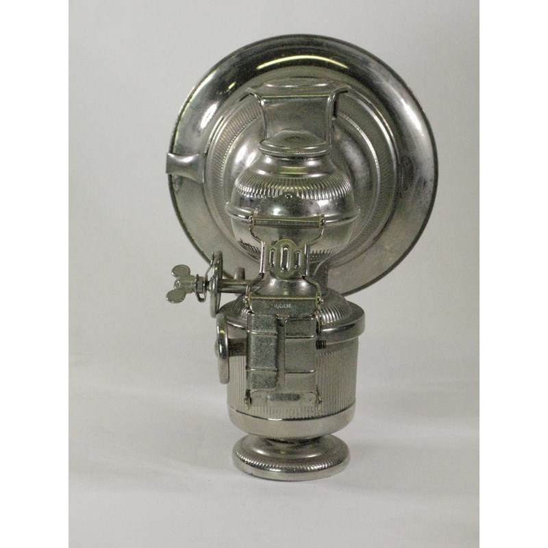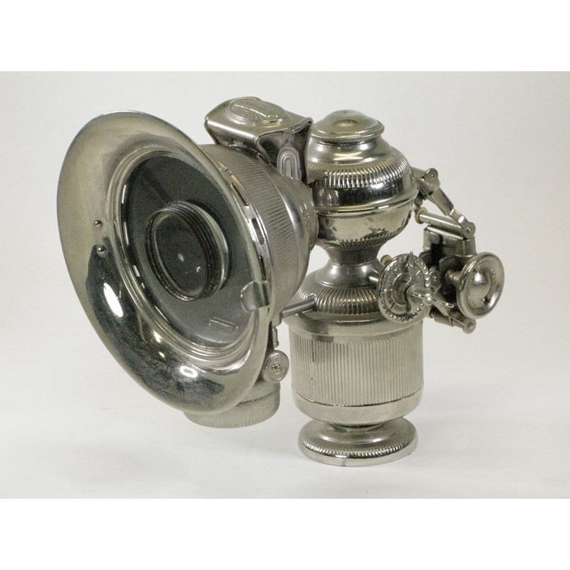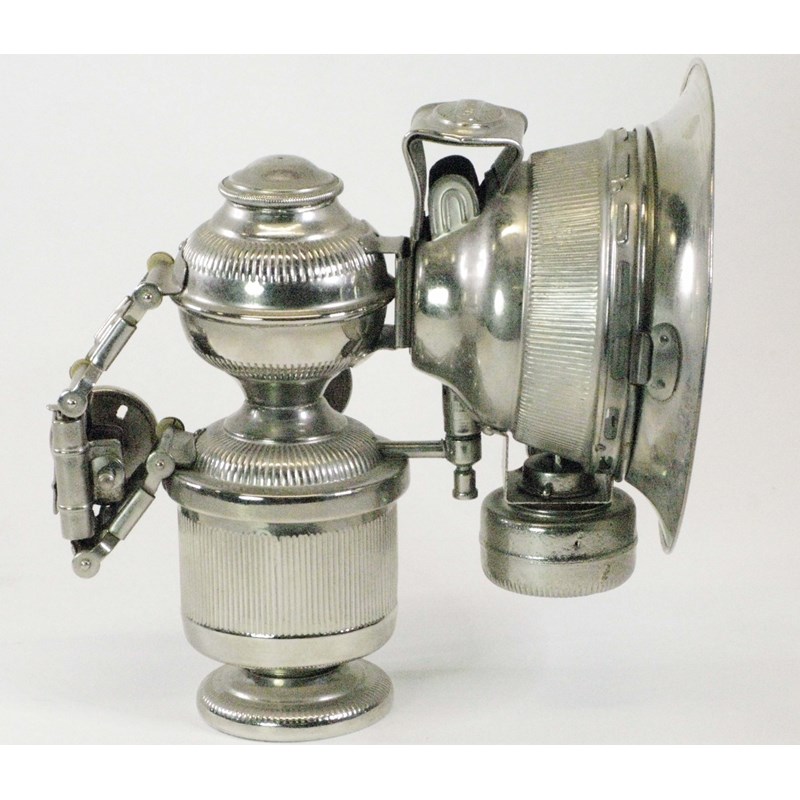 A combination lamp identified by its decorative embossed ribbing, this acetylene gas lamp possesses a small auxiliary oil reservoir, central condenser lens and all fittings. In excellent nickel-plated condition. See ECL129 for a similar lamp. 6-inches high. (1)