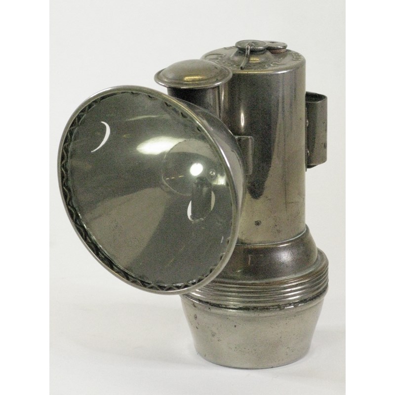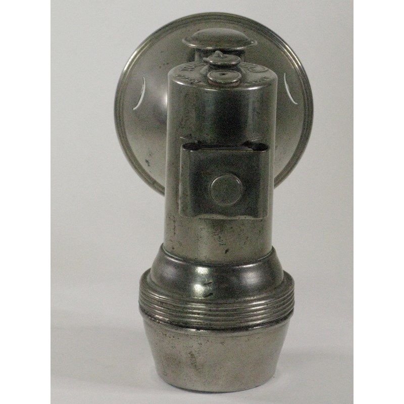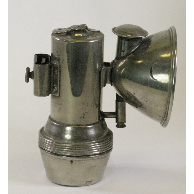 A 1900 F. Baldwin 'Crescent' Acetylene Gas Lamp. With its original nickel-plated finish, this lamp was unusual in that side glasses were replaced with a crescent piercing either side of the head and the front glass was held in place by an elaborate concatenated wire retaining spring. In excellent condition. 6-inches (15cms) high. AGL 97.