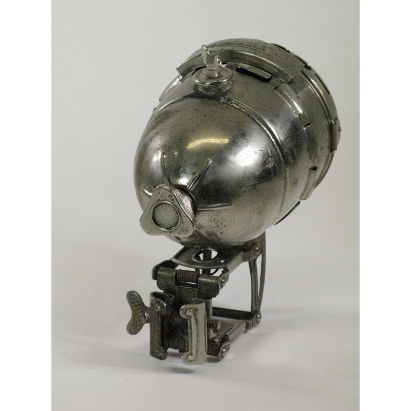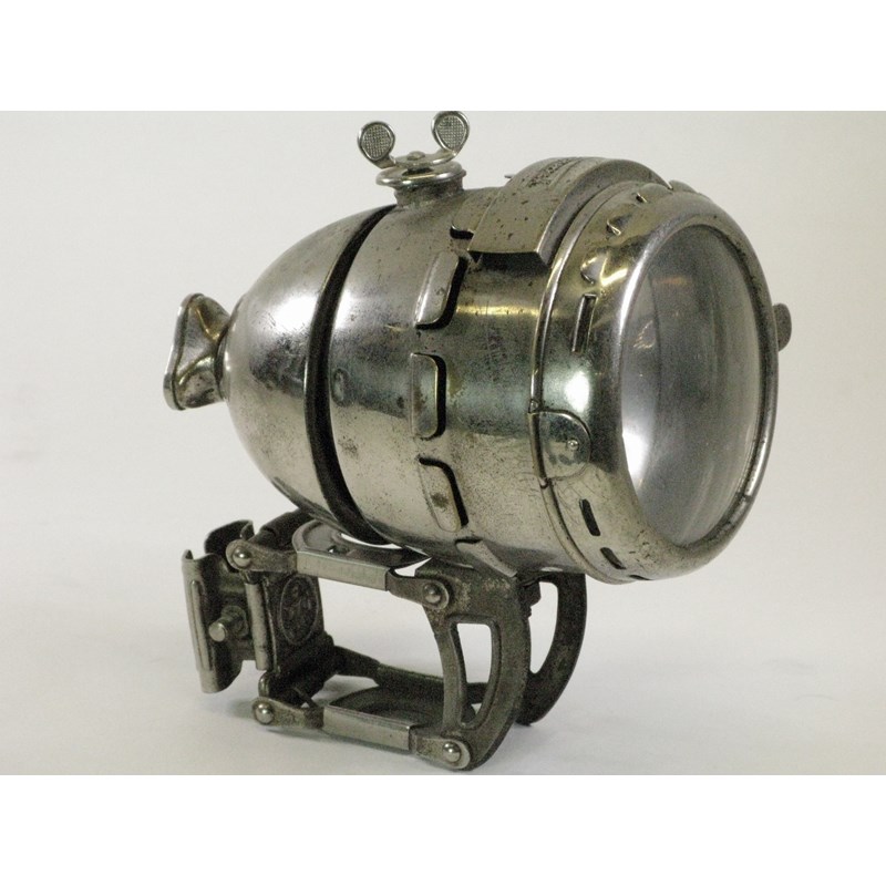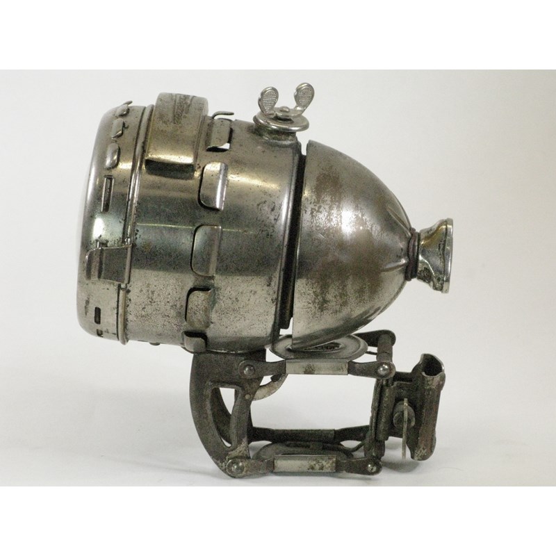 An unusual design, suitable for either bicycle or light motorcycle. A highly original lamp, with a rear-mounted carbide of calcium chamber and an unusual device for holding the spring bracket in a permanent position. Nickel-plated on brass