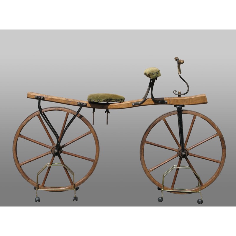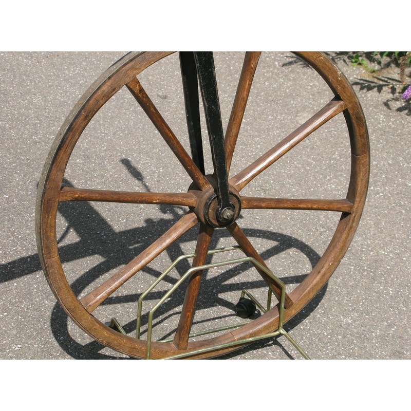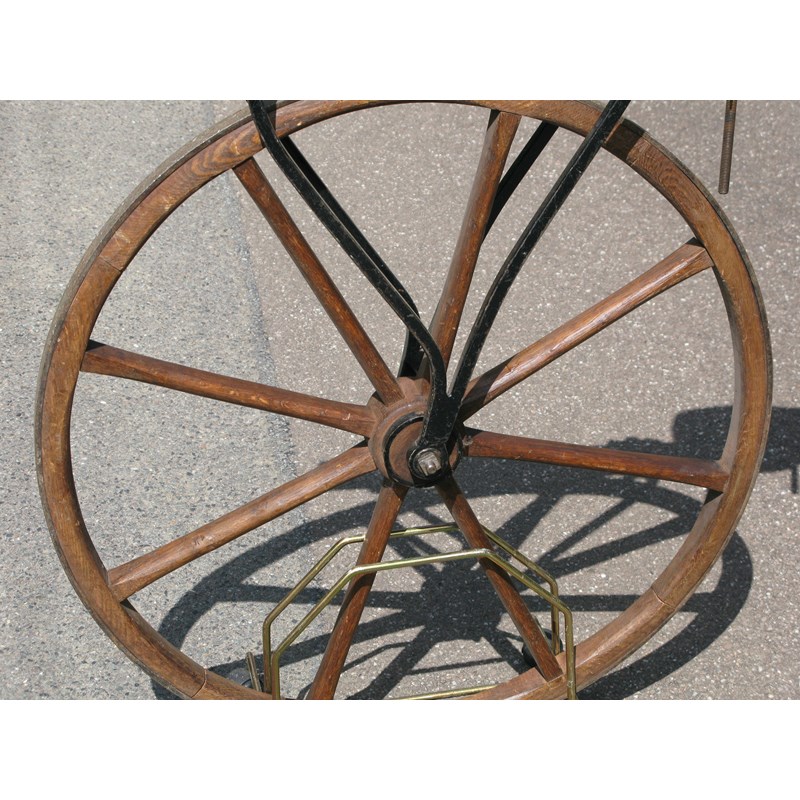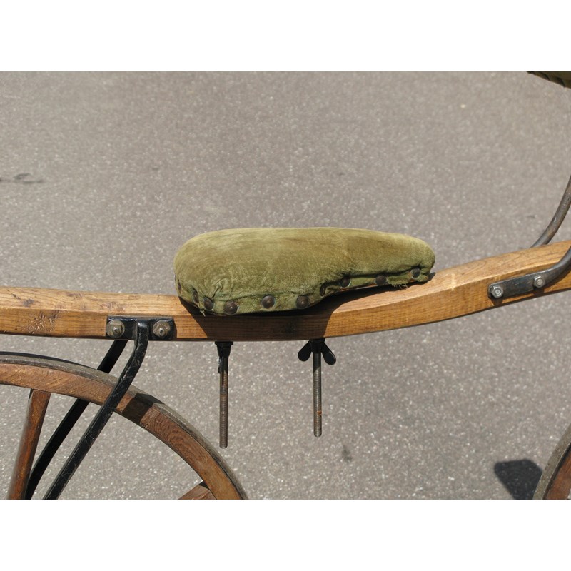 A well-constructed machine having good, sound 29-inch wheels, each with eight spokes, iron forks, nicely-shaped elbow support, adjustable padded saddle and steering handlebars with turned wooden grips. The frame is of oak.