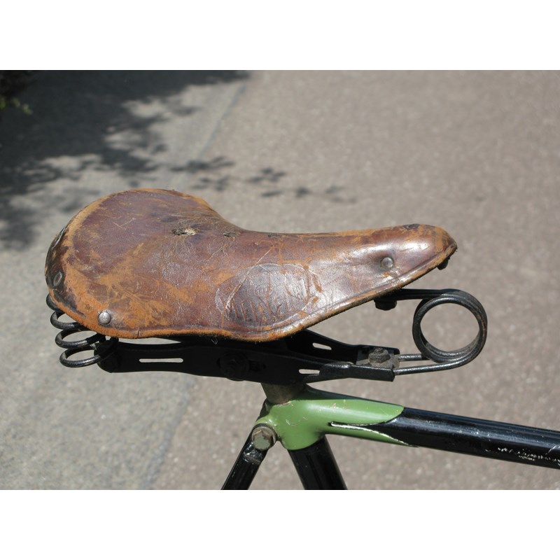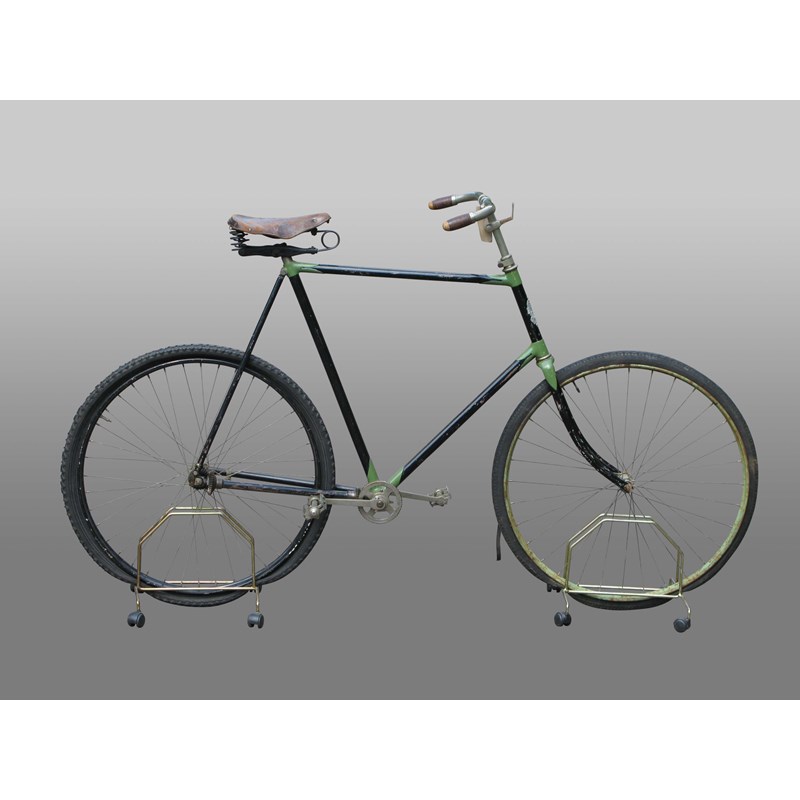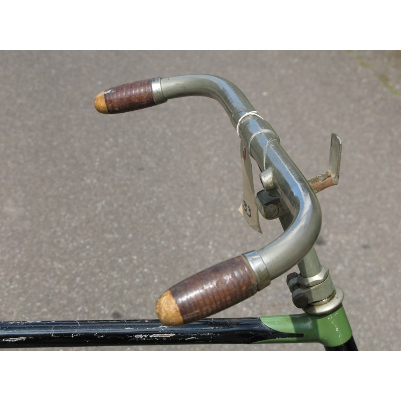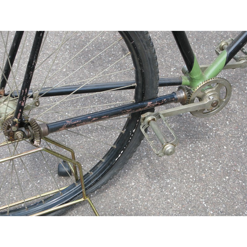 A good restoration project, having a 26-inch diamond-frame featuring duck-beak lugs, the shaft drive gearing in working order, back-pedalling brake, non-matching wheels, and nickel-plated 18-inch handlebars with original turned grips. Missing its headstock (internal) plunger front brake.