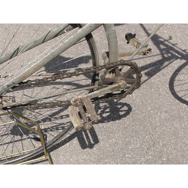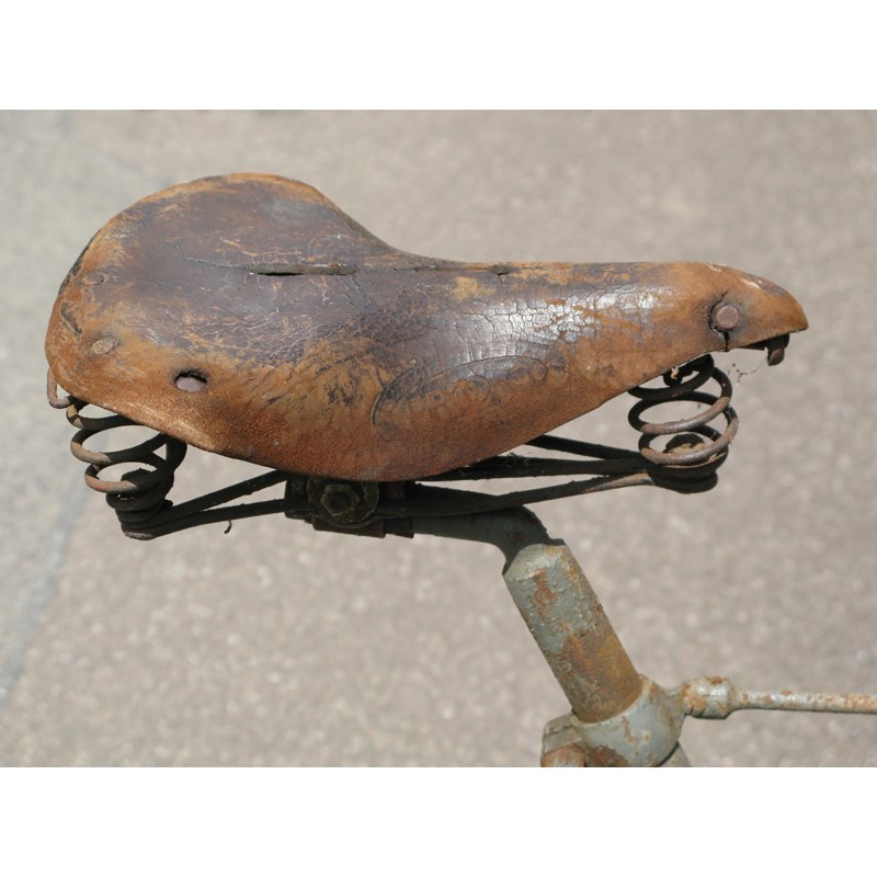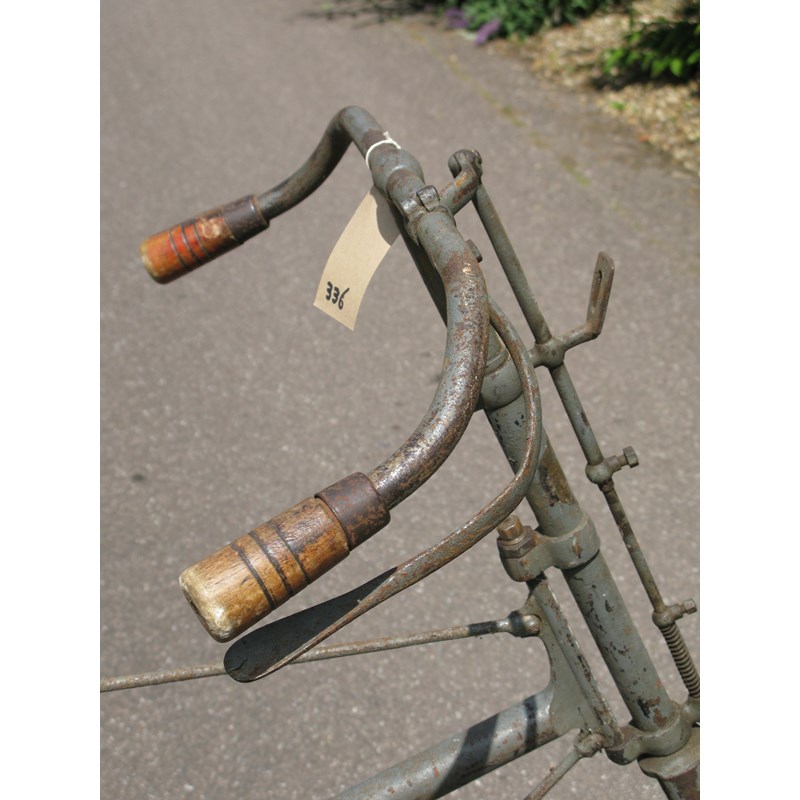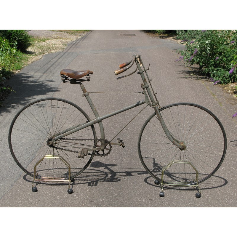 A barn discovery in recent years, this sound restoration project features ¾-inch rims and solid rubber tyring to both wheels, 22-inch handlebars with later turned wooden grips, inch-pitch driving chain, 6-inch slotted cranks, rubber block pedals, mounting step, later leather saddle, plunger brake and lamp bracket.