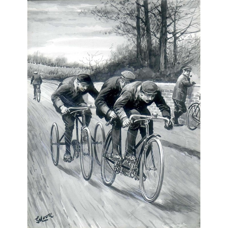 A monochrome vertical format drawing for use with Cycling magazine circa 1894, signed by the artist in the bottom left-hand corner, depicting two male cyclists on a tandem bicycle being hotly pursued by another man riding a tricycle. Painted on card, a note in red ink on the reverse reads 'Cycling Friday' together with a small ink stamp stating 'Cycling No. 187', indicating that the drawing was intended for publication in this weekly illustrated magazine. Mounted, framed and glazed. Image size 22.5 x 17.5cm. Good condition, with just a slight suggestion of pale browning along the inside edges of the mount.