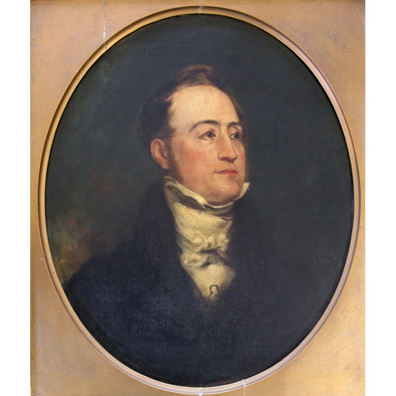 Bust length, wearing a dark coat and white neckcloth, mounted oval, oil on canvas