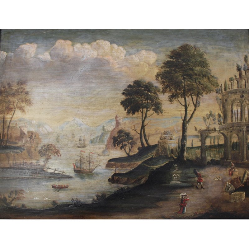 AN IMAGINARY LANDSCAPE SCENE WITH FIGURES, BUILDINGS AND BOATS