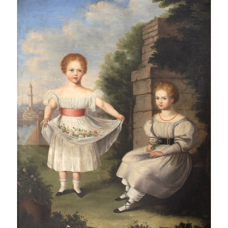 Each depicted full length, wearing pale dresses, the standing sister holding flowers in her skirts, the seated sibling holding flowers, a tower across a lake beyond, oil on canvas