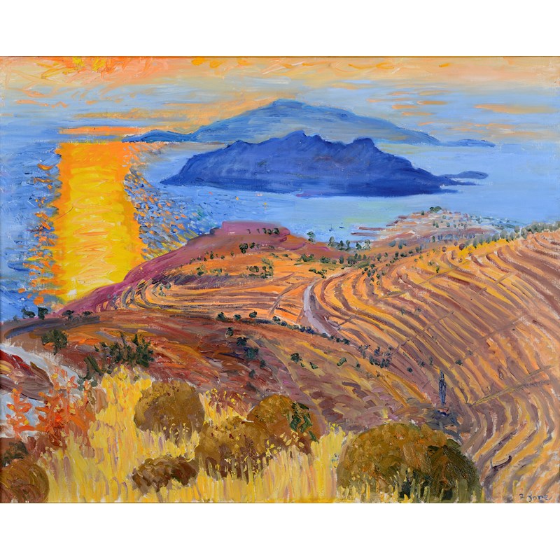 AEGINA: BEFORE SUNSET, VIEW OF THE ISLANDS MONI SAN ANGHISTRI (sic) FROM SFENDOURI