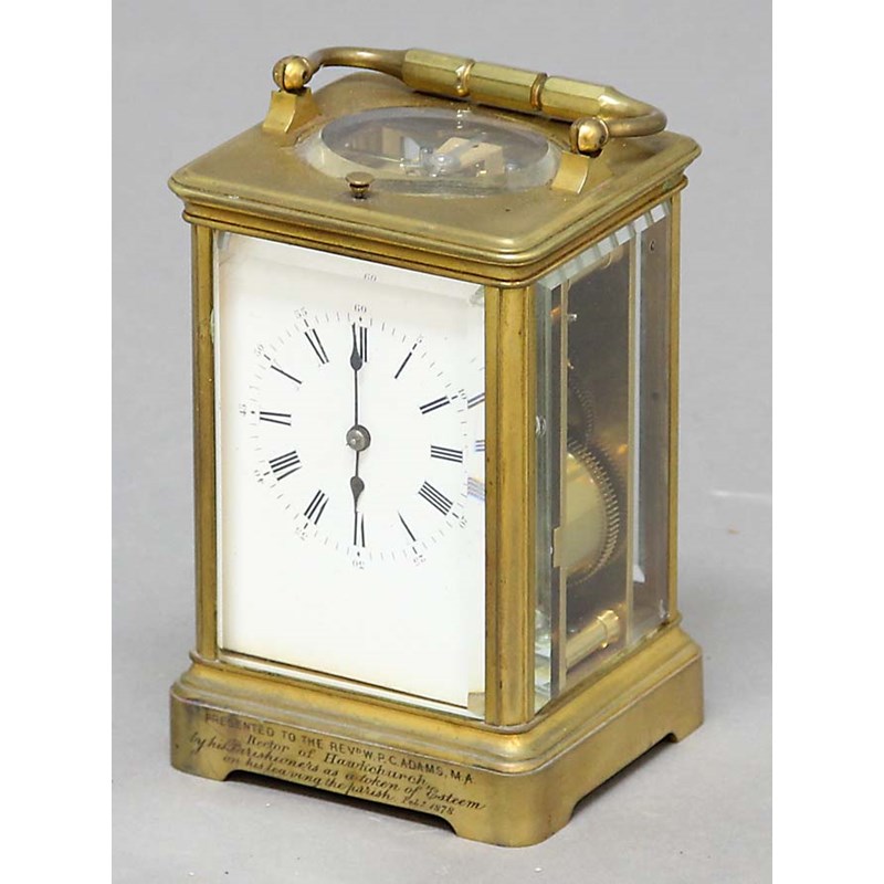BRASS FOUR PANE CARRIAGE CLOCK, the enamelled dial on an eight day movement with repeater mechanism and half hourly striking to a gong, with red leather carry case and keys, height excluding handle 14cm (2)