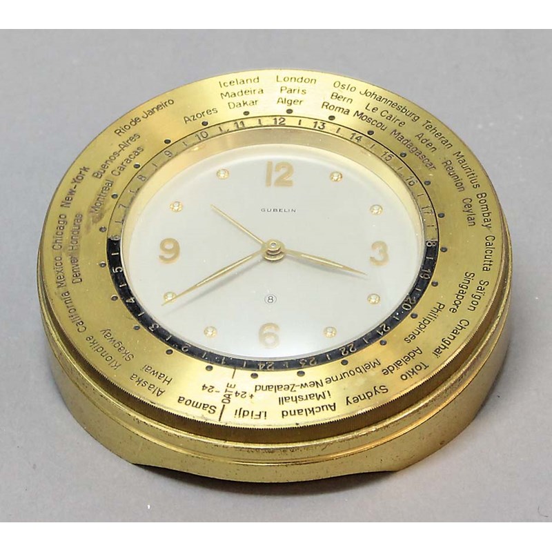 GUBELIN BRASS DESK CLOCK, the 2 3/4" dial inside a bezel marked with world time zones, on an eight day movement with alarm, diameter 11cm