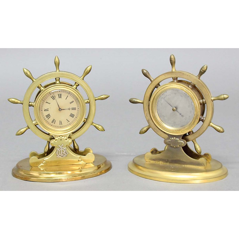 MATCHED PAIR OF BRASS SHIPS WHEEL CLOCK AND BAROMETER,