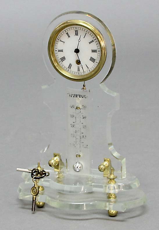 FRENCH GLASS MANTEL CLOCK marked Réaumur, the case with thermometer and brass finials, height 20cm