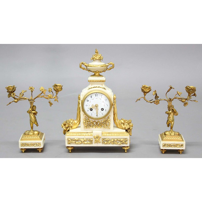 FRENCH ALABASTER AND GILT METAL MOUNTED CLOCK GARNITURE,