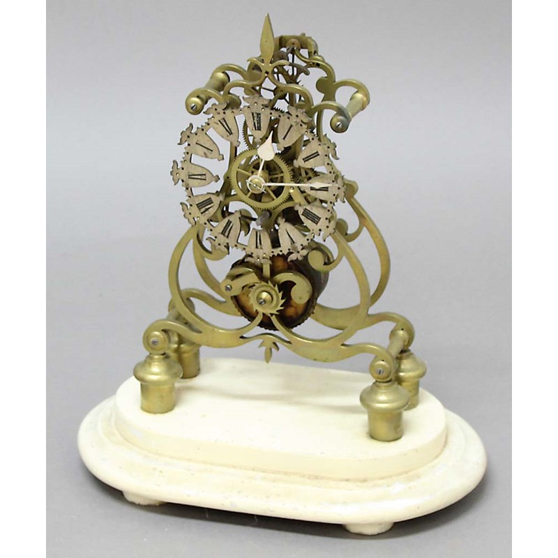 BRASS SKELETON CLOCK, the 5" silvered, pierced dial on a brass, eight day, single fusee, chain driven movement, on a marble base, with key and pendulum, height excluding base 30cm