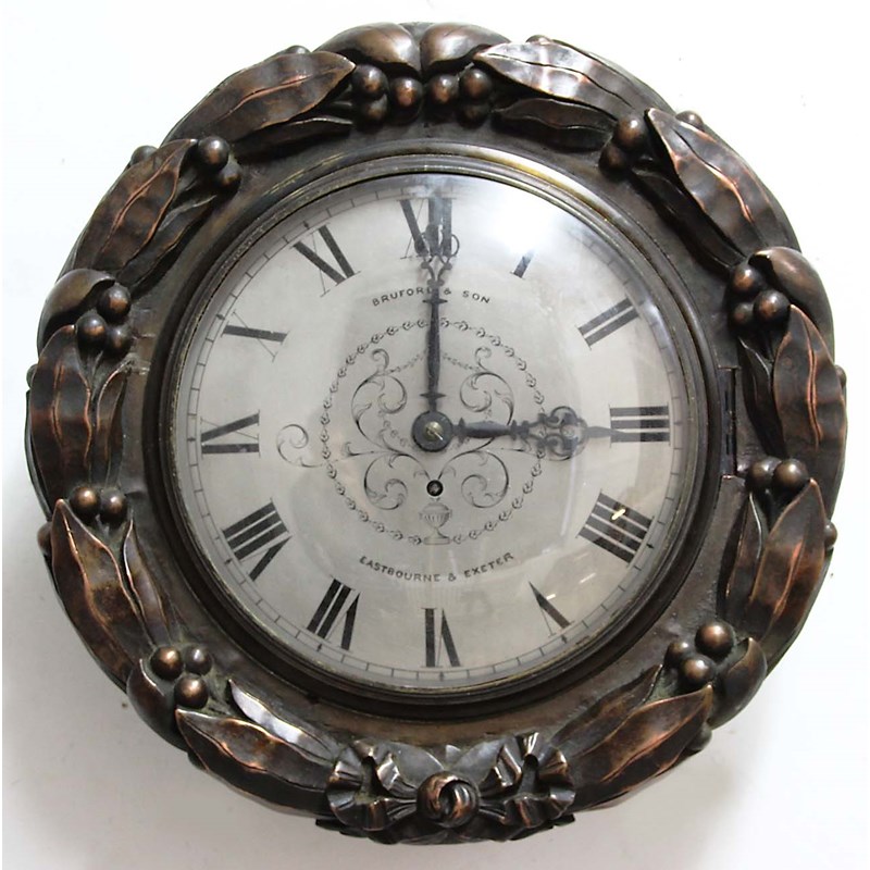 the 11" silvered dial inscribed Bruford & Son, Eastbourne & Exeter, on a brass, eight day, single fusee movement, the wood frame with a copper coating, decorated with berries and leaves in high relief, with key and pendulum, diameter 45cm