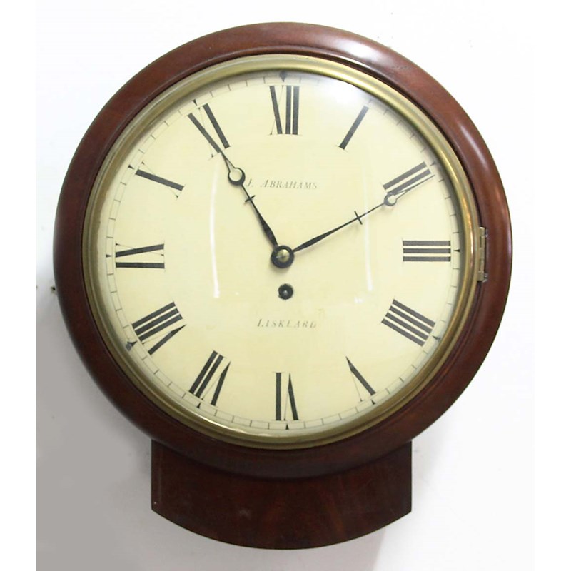 MAHOGANY CIRCULAR WALL CLOCK, 19th century, the 12" enamelled dial inscribed J. Abrahams, Liskeard, on a brass, eight day, single fusee movement, with dial and key, height 45cm