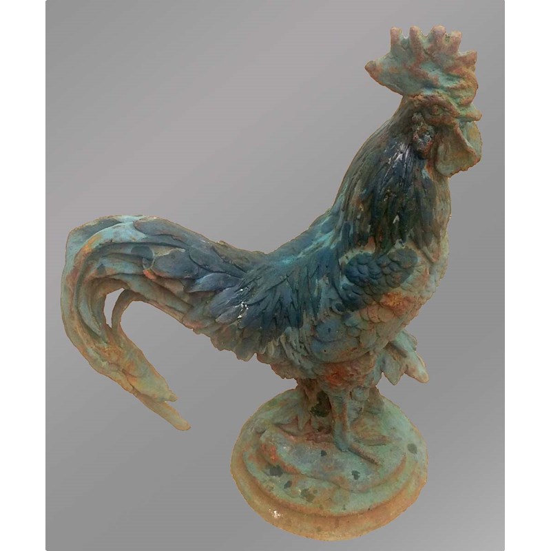CAST IRON COCKEREL FIGURE with blue-green paint, height 42cm