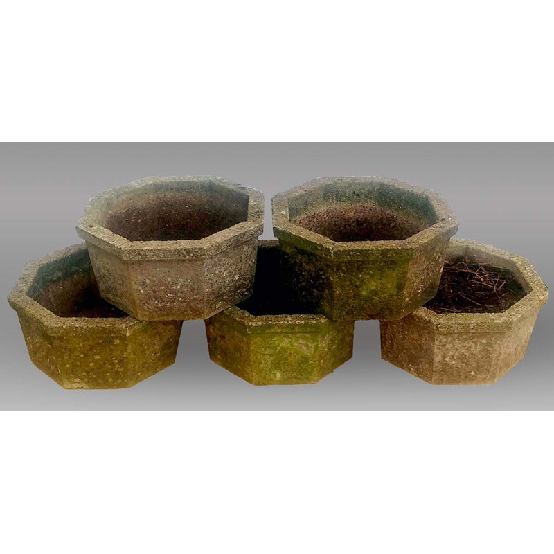 SET OF FIVE WEATHERED RECONSTITUTED STONE PLANTERS of hexagonal form, height approx. 20cm, width approx. 42cm (5)