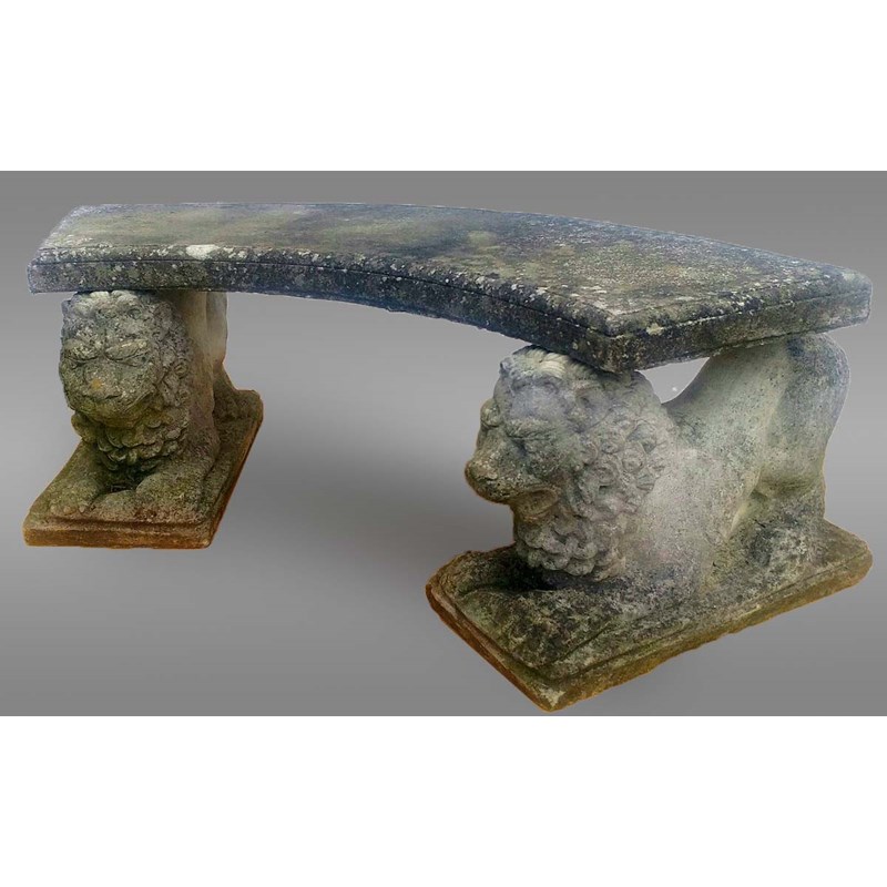 WEATHERED RECONSTITUTED STONE GARDEN BENCH of curved form, raised on a pair of recumbent lions, height 44cm, width 120cm, depth 36cm