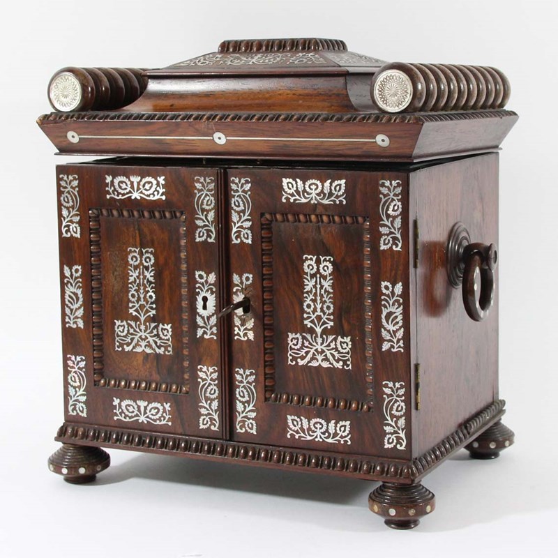 REGENCY ROSEWOOD TABLE CABINET with sarcophagus top, turned rails and mother-of-pearl inlay, the interior with fitted drawers, leather panelling and contents, height 35cm, width 32cm, depth 24cm