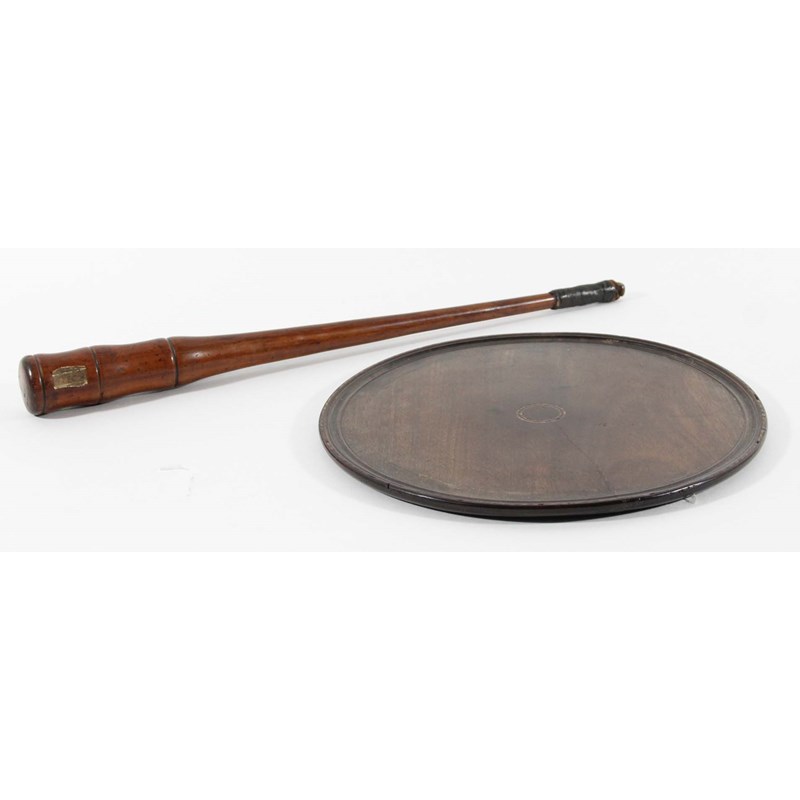 LIGNUM VITAE BATON probably 19th century, of unknown use, leather tipped and bearing a W.J. Shepherd Collection label marked 'H2323', length 39cm; together with a mahogany circular platter, diameter 24cm (2)