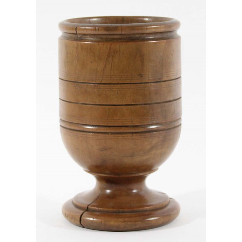 LARGE SYCAMORE MORTAR possibly 18th century, the deep cylindrical bowl with incised bands on turned, stepped base, height 19cm