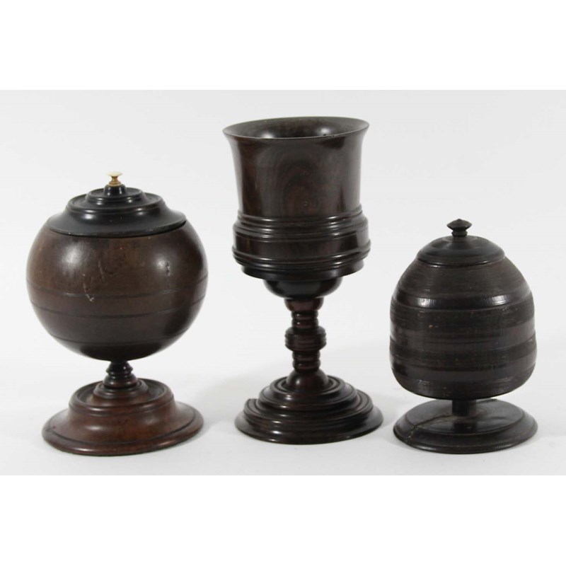 TURNED HARDWOOD CHALICE with knopped stem and stepped base, 20cm, together with two other turned cups and covers (3)