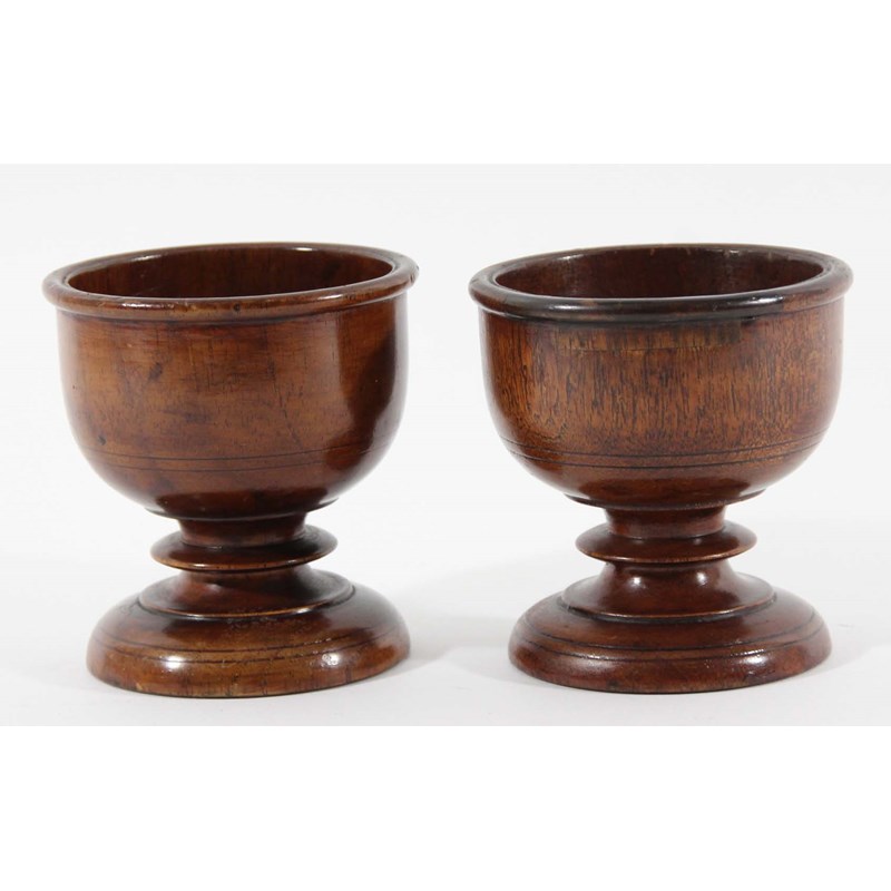 PAIR OF MAHOGANY GOBLETS the circular bowls with incised banding on knopped stems and turned, domed bases, height 10.5cm (2)