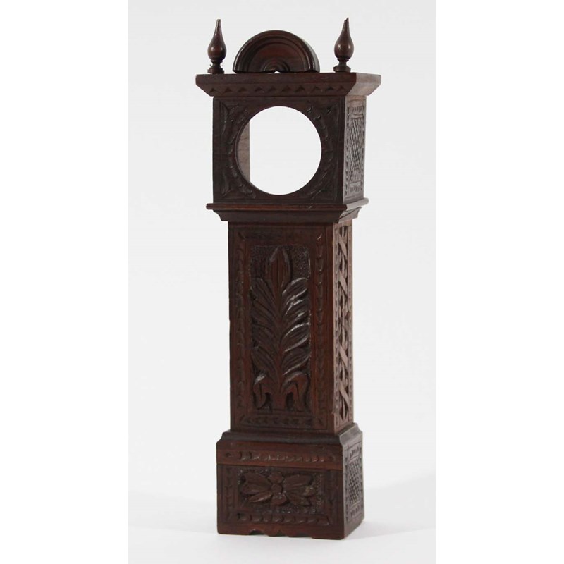 CHIP CARVED OAK POCKET WATCH CASE in the form of a miniature longcase, carved with flowers and trelliswork, height 30cm