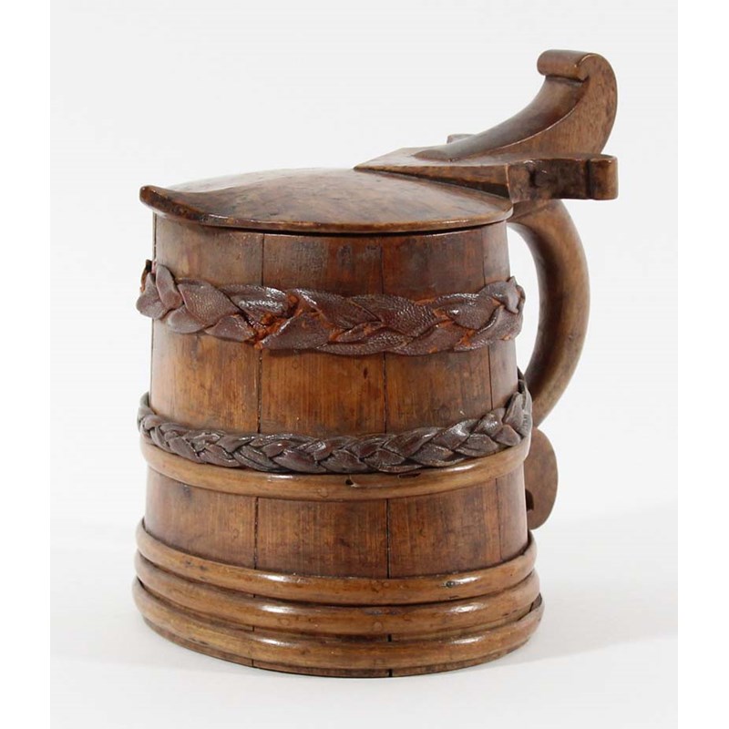 NORWEGIAN BIRCH AND PINE PEG TANKARD of oval form and bound in leather strips, with scrolling handle, height 17cm