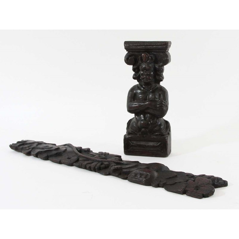 CARVED OAK FIGURAL TERM 17th century, length 24cm; together with another carved oak panel, length 51cm (2)