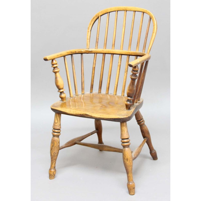 ASH AND ELM WINDSOR CHAIR, the mid-height back on baluster supports, solid seat and H stretcher, height 87cm