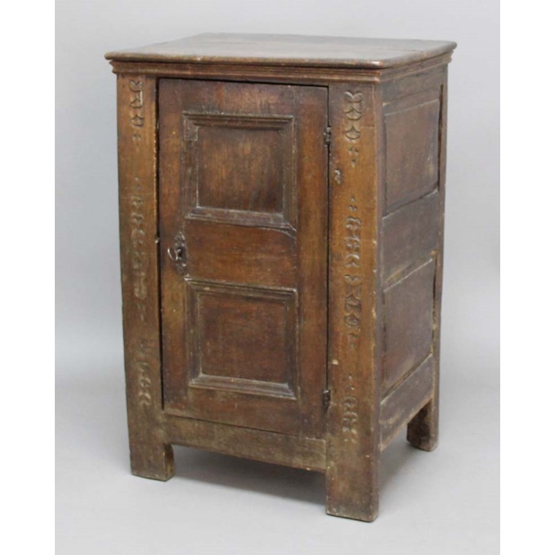 17th century and later, the twin panelled door flanked by stylised floral carved uprights, probably adapted, height 37cm, width 65cm, depth 46cm