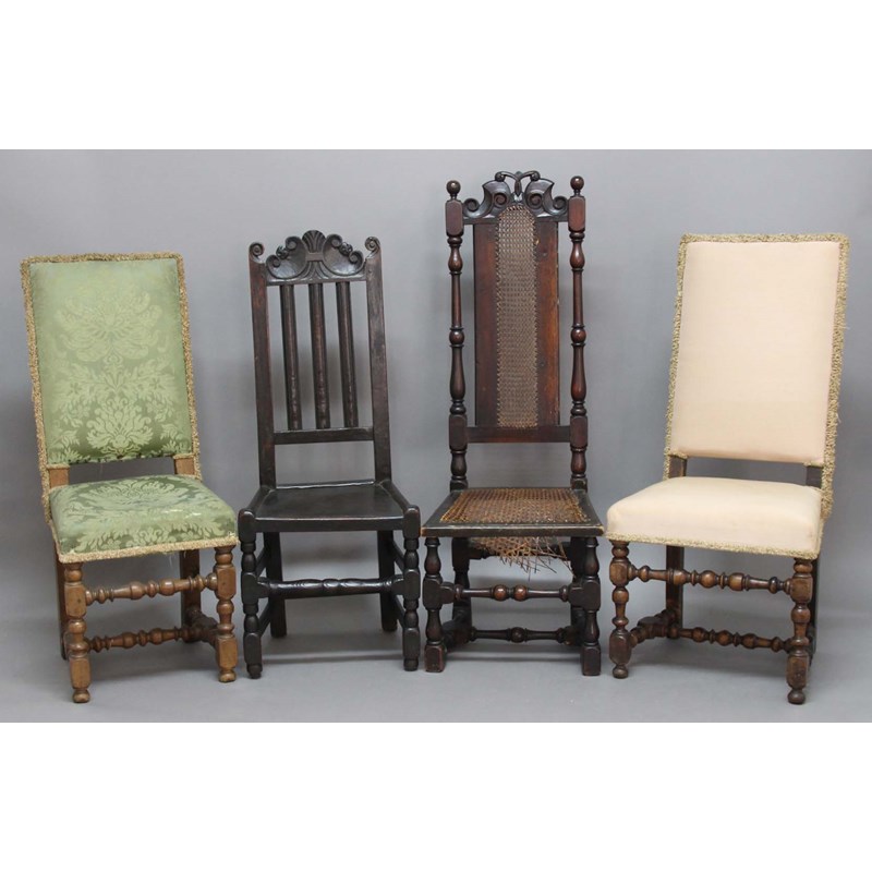 the rectangular backs above stuffed over seat, block and turned legs and stretchers; together with an oak side chair and a caned oak chair (4)