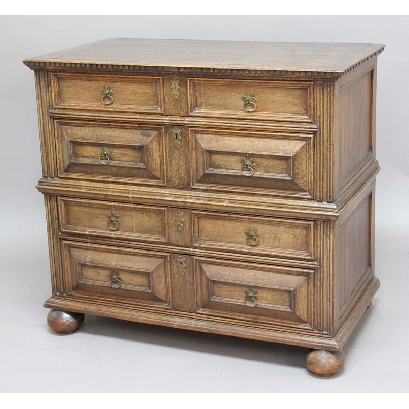 CAROLEAN STYLE OAK CHEST, probably 18th century, with four long and geometrically moulded drawers, in two sections, on bun feet, height 96cm, width 112cm, depth 55cm